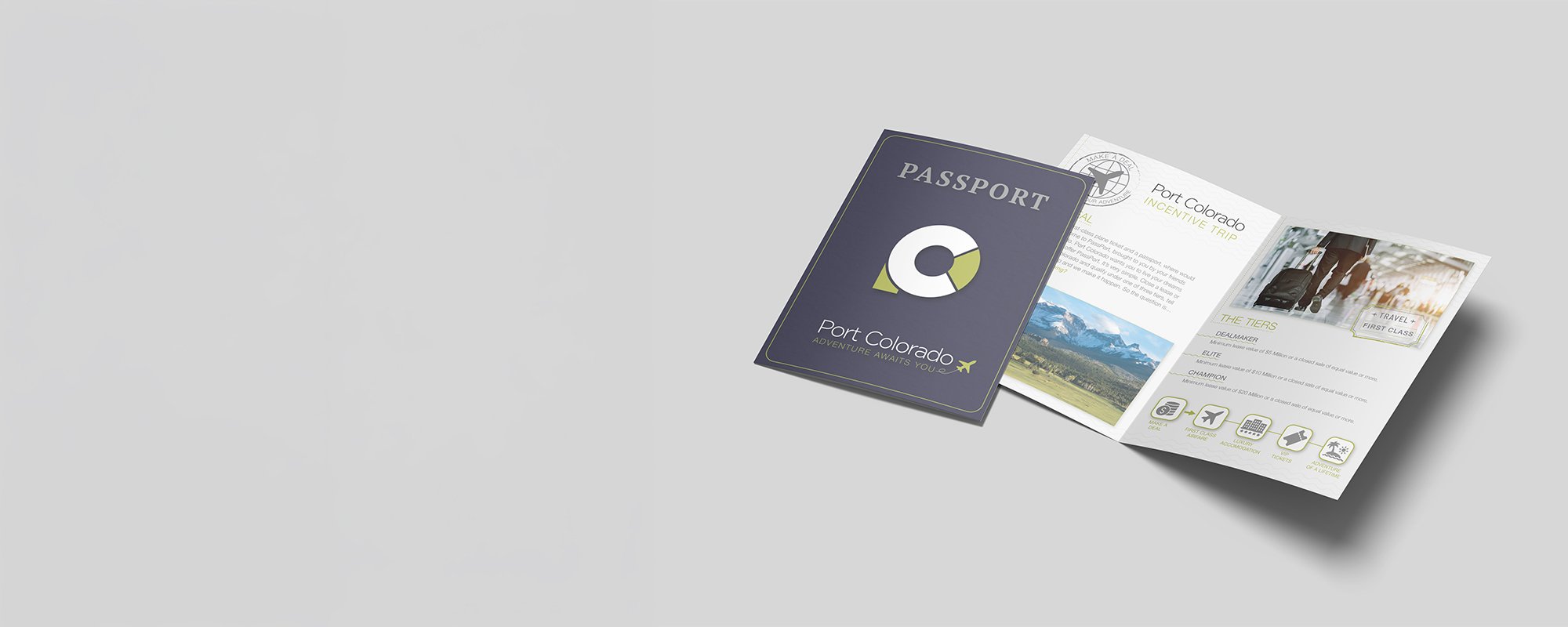 A passport-inspired booklet designed to promote an incentive program for industrial real estate brokers. The piece communicates how brokers can qualify for tiered rewards by closing leases or sales with Port Colorado, turning performance milestones into an engaging, travel-themed experience.